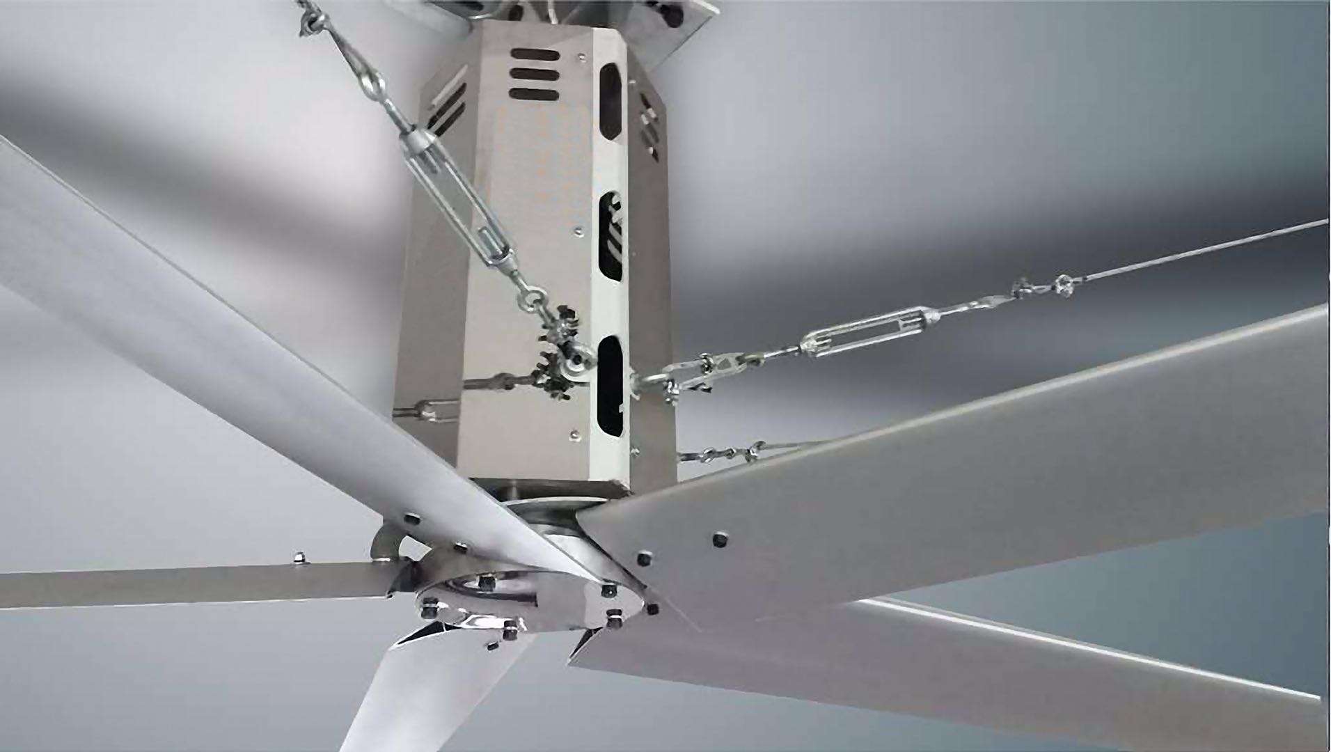 大型節能吊扇扇葉驅動主盤采用鋼制一體化設計,具有非常完美的抗拉抗疲勞特性,經數控精確加工而成,再通過 1000 噸大型液壓模具液壓成形,表面經過細磨酸化,通過粉末噴涂再進行高溫烘烤,從而達到防腐塑漆涂層,真正做到產品的結構完美特性,更好的提高產品安全性能;大型節能吊扇驅動主盤采用數控精密機械的裝配方法, 進行與驅動盤裝置裝配,機械緊密性好,動平衡穩定,鎖卡式安全裝置結構,確保安全間隙距離控制在 2mm 以內,縮小了保險裝置之間的間隙,確保吊盤有一點點的松動情況下,也能在較短的時間及距離起到阻止及防墜作用,大大降低吊墜運行安全風險。
